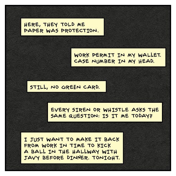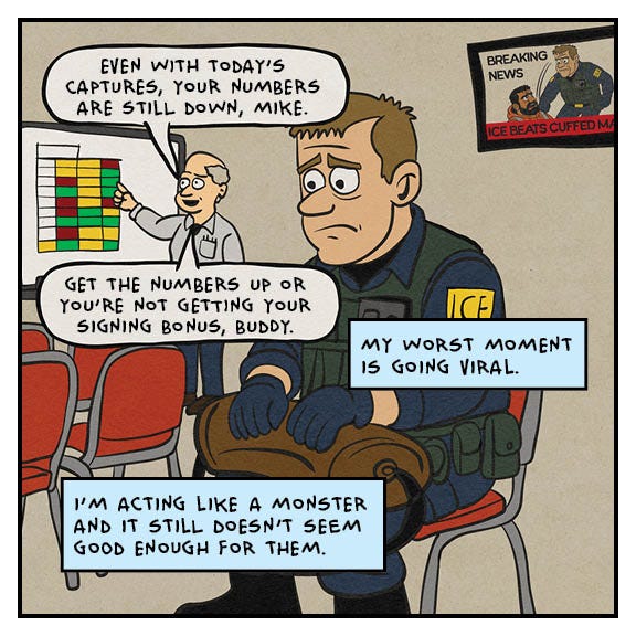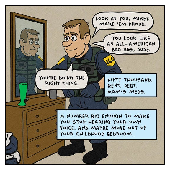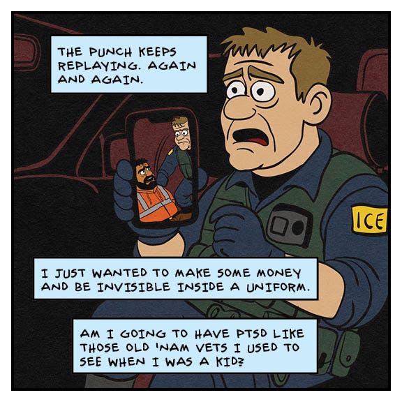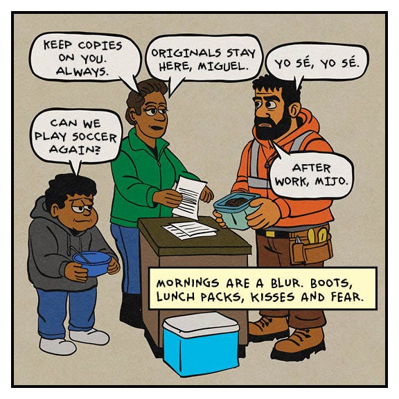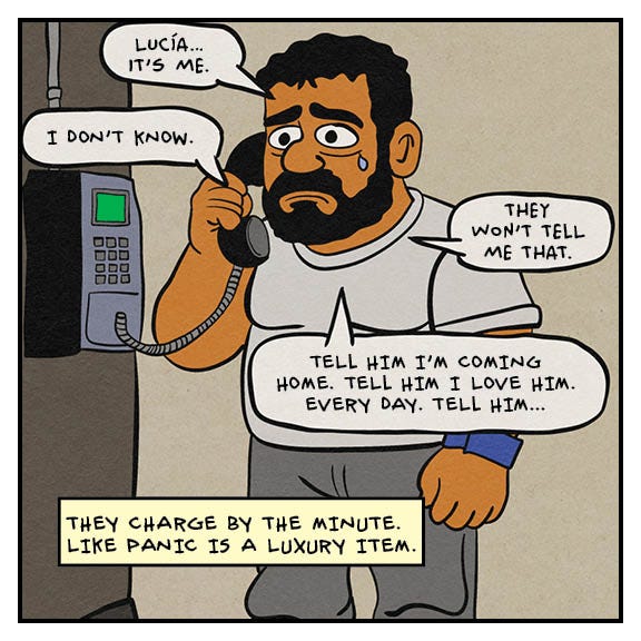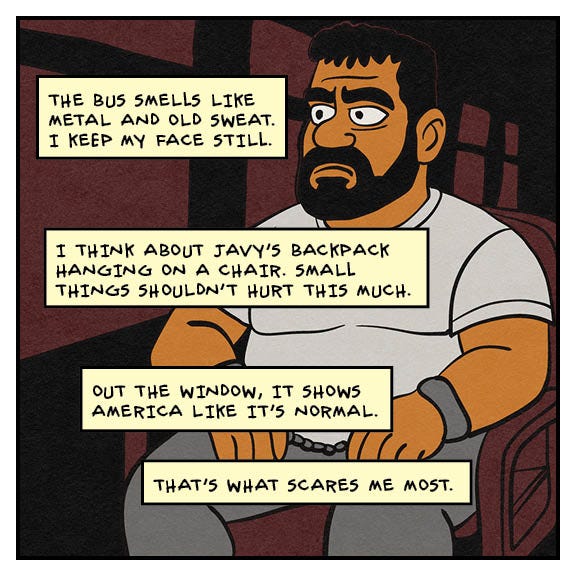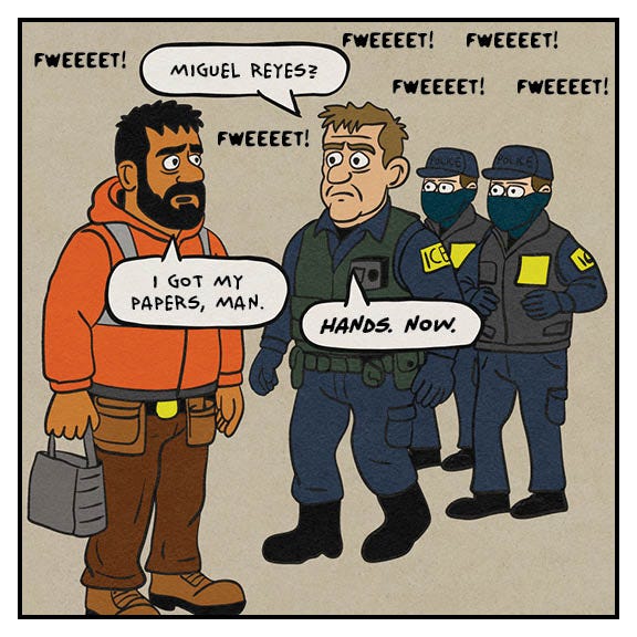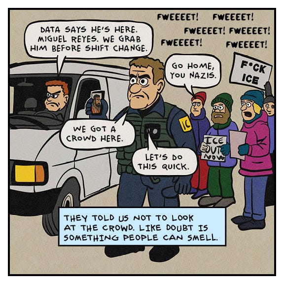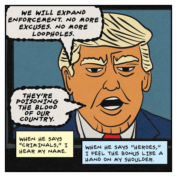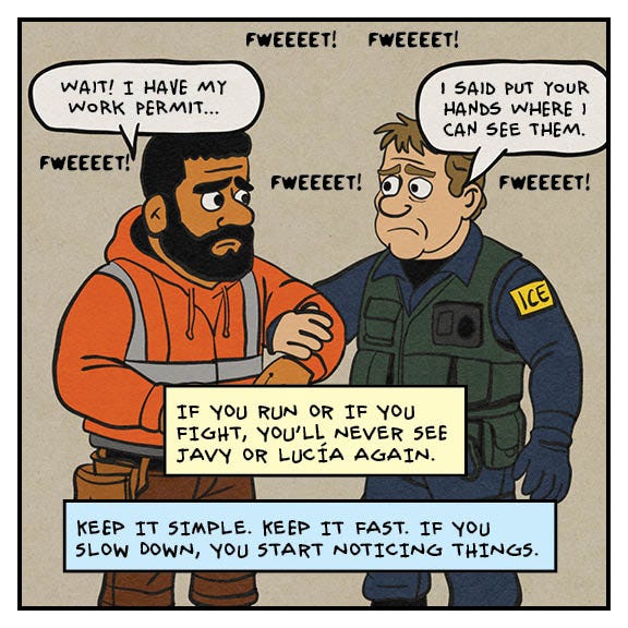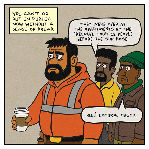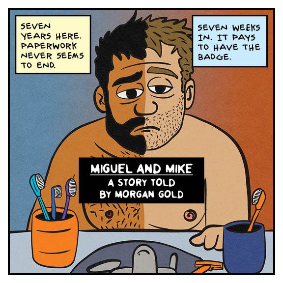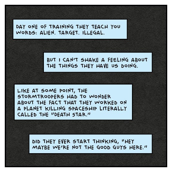 When I was working on this week’s comic, I was a bit worried that some folks might accuse me of “both sides-ing” the fictional story of Mike and Miguel. To be clear, that’s not where I’m coming from on this one. While Mike suffers consequences that might make you feel greater empathy, those consequences pale in comparison to the horrors that Miguel endures in the story.
