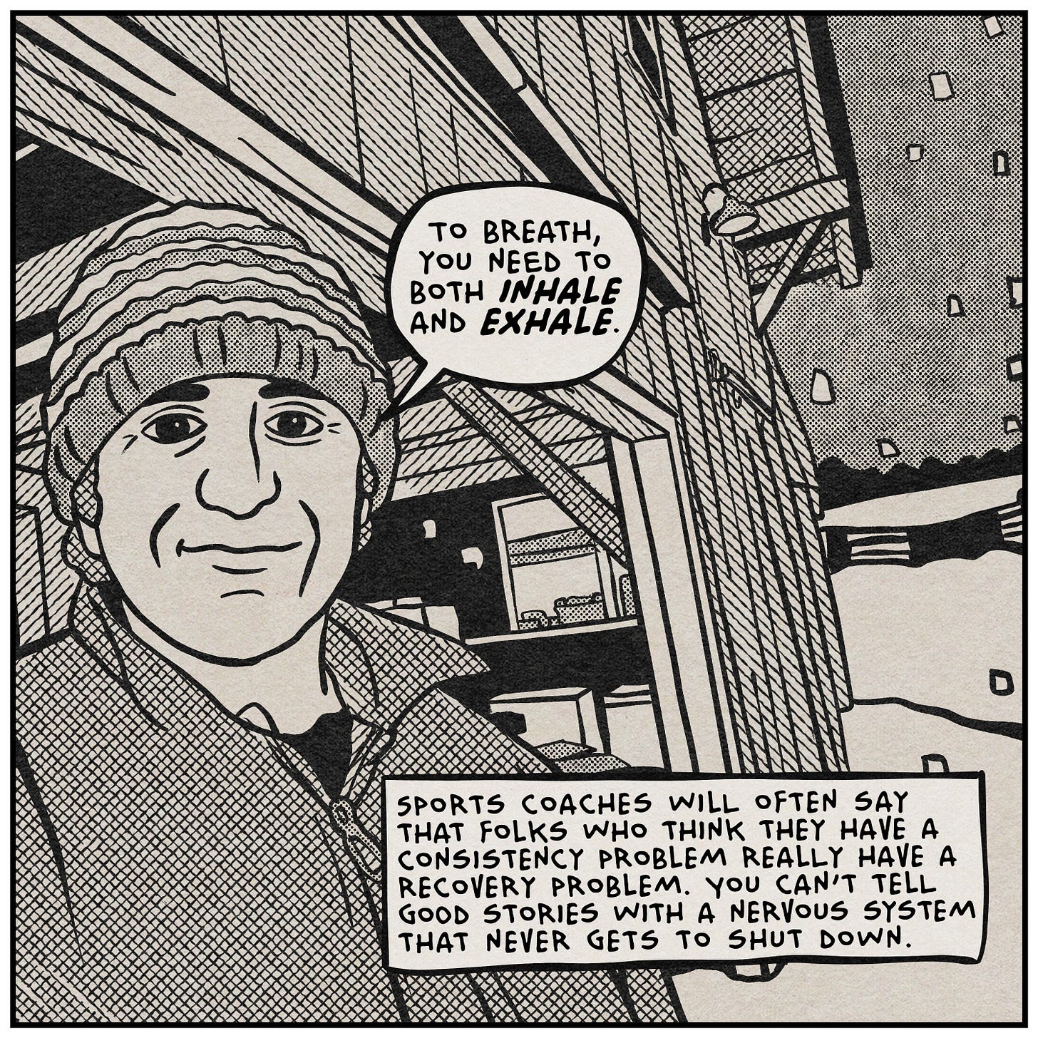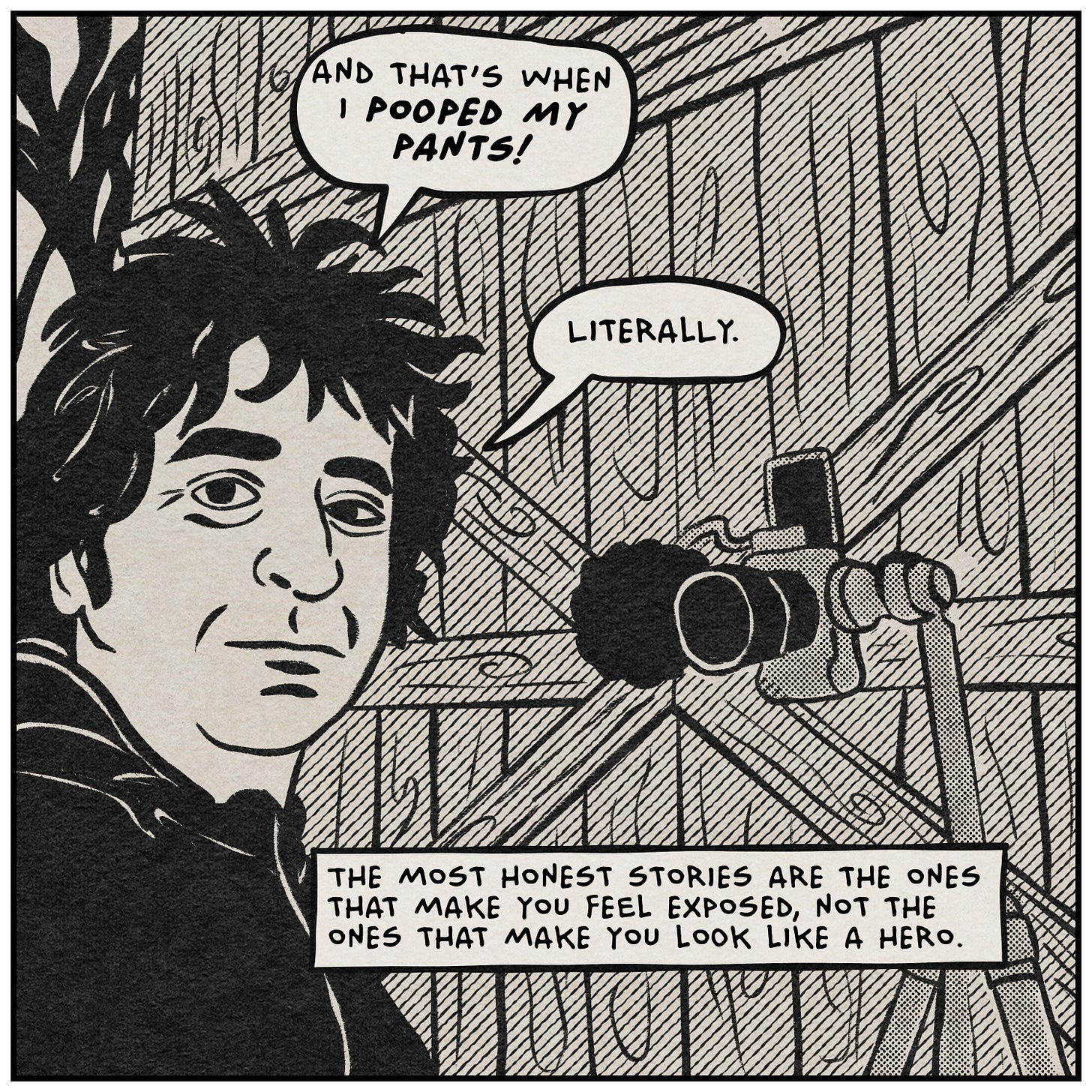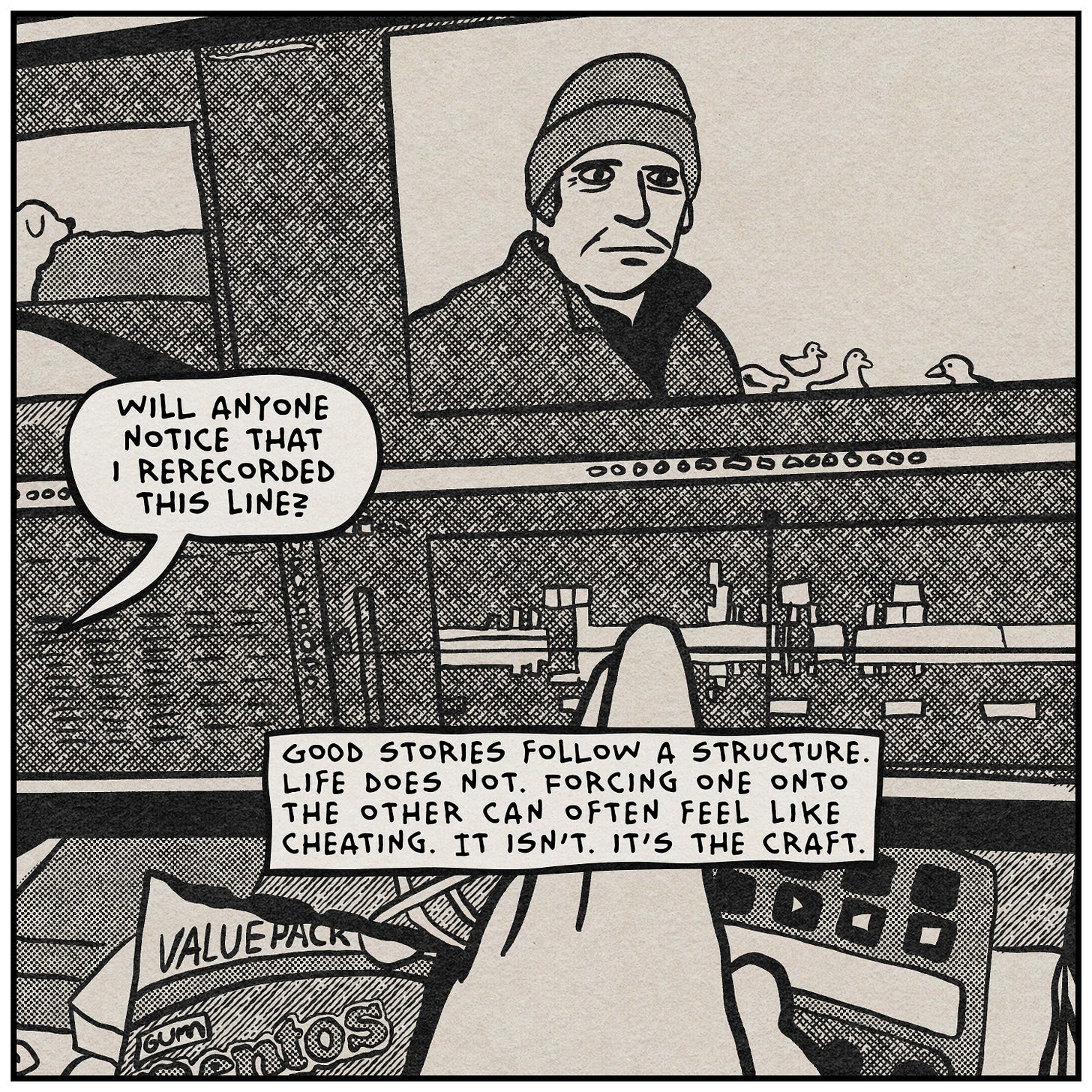 The drawing style this week is a little different, and I want to explain why. I think it’s actually relevant to the topic. Instead of drawing in my usual style, I went back to something I used to do a lot in animation—tracing and simplifying photographs. Everything you’re seeing in these panels started as a photo from my camera roll over the last couple of years. I brought them into the iPad and drew them out by hand. The result looks a lot like the photo. But it’s obviously not the photo. A significant amount of detail was edited out of the translation. I didn’t plan it this way, but it turned out to be a pretty good metaphor for the whole essay. Also, I just got a new Procreate brush pack that replicates halftones and cross hatching really well. You’re going to see over-using those effects a lot over the next few weeks.