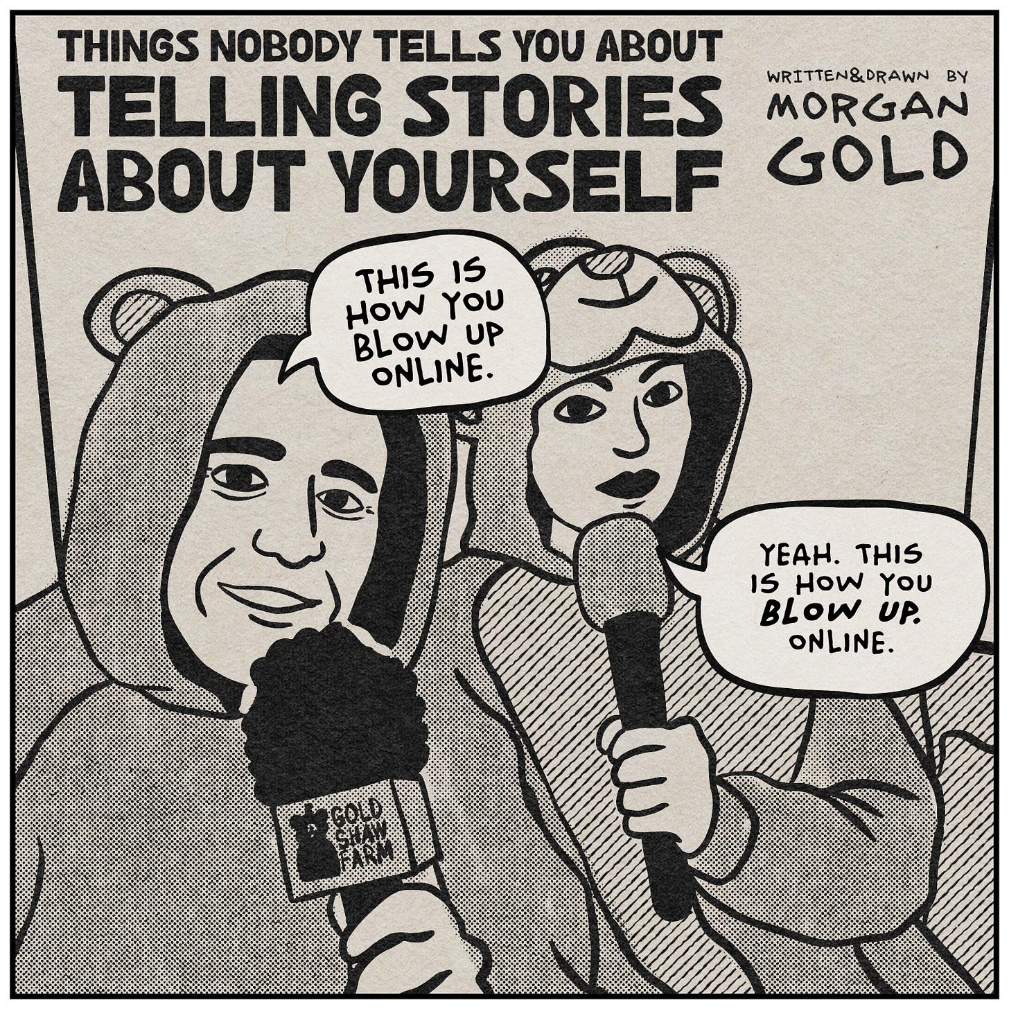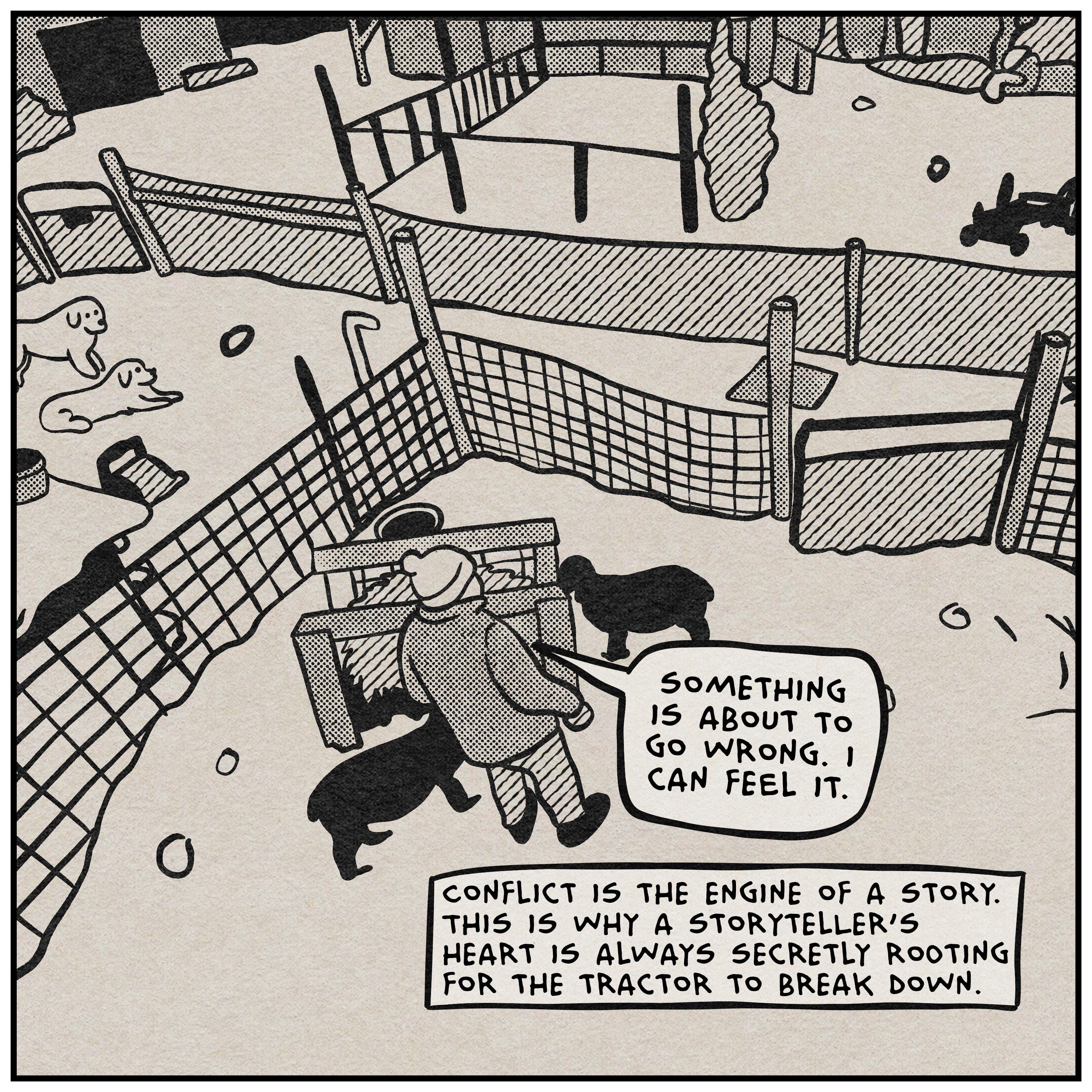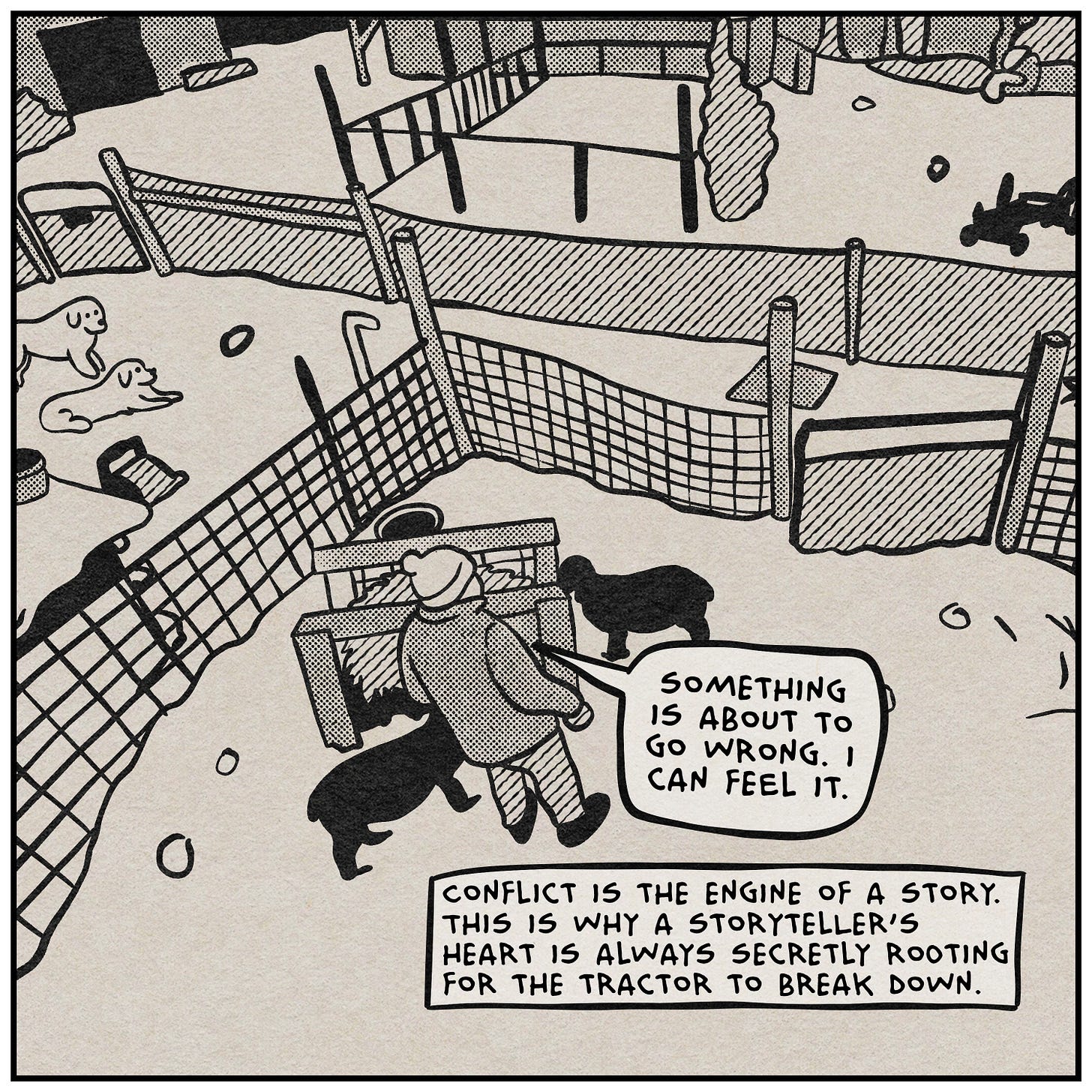 The drawing style this week is a little different, and I want to explain why. I think it’s actually relevant to the topic. Instead of drawing in my usual style, I went back to something I used to do a lot in animation—tracing and simplifying photographs. Everything you’re seeing in these panels started as a photo from my camera roll over the last couple of years. I brought them into the iPad and drew them out by hand. The result looks a lot like the photo. But it’s obviously not the photo. A significant amount of detail was edited out of the translation. I didn’t plan it this way, but it turned out to be a pretty good metaphor for the whole essay. Also, I just got a new Procreate brush pack that replicates halftones and cross hatching really well. You’re going to see over-using those effects a lot over the next few weeks.