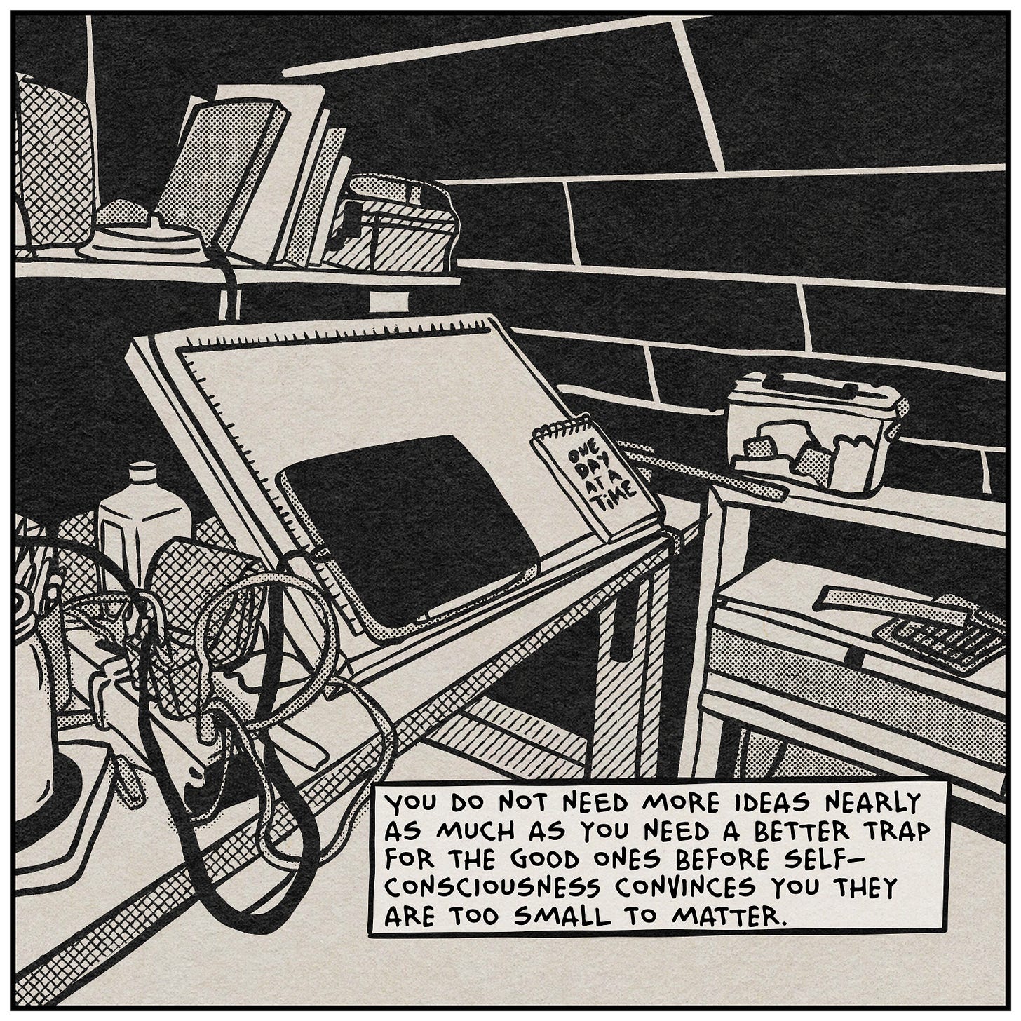 Pretty much every idea in here—and definitely every comic panel—started as a scrap in a notebook. Little things I’d noticed and written down over the years, waiting for a home. This week’s post is basically what happens when you finally stop waiting and just tape them all to the same wall.