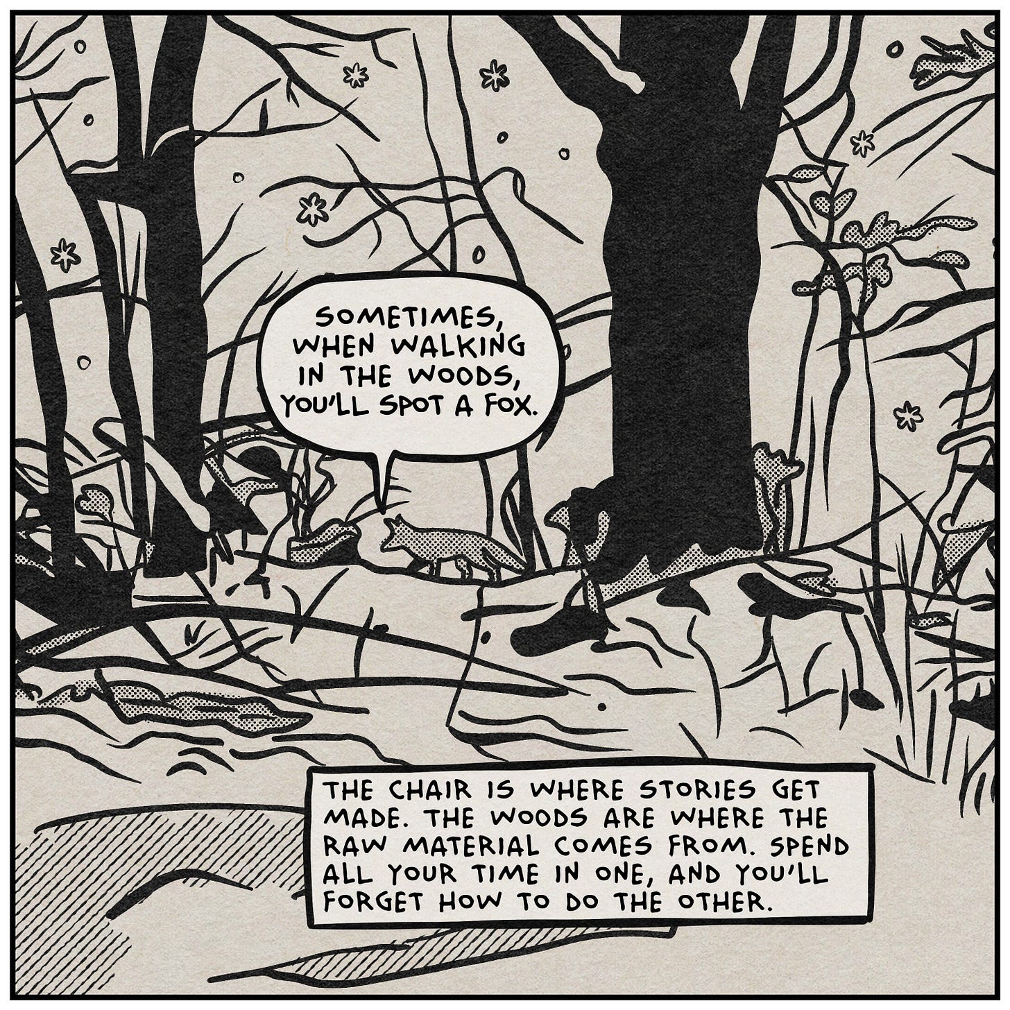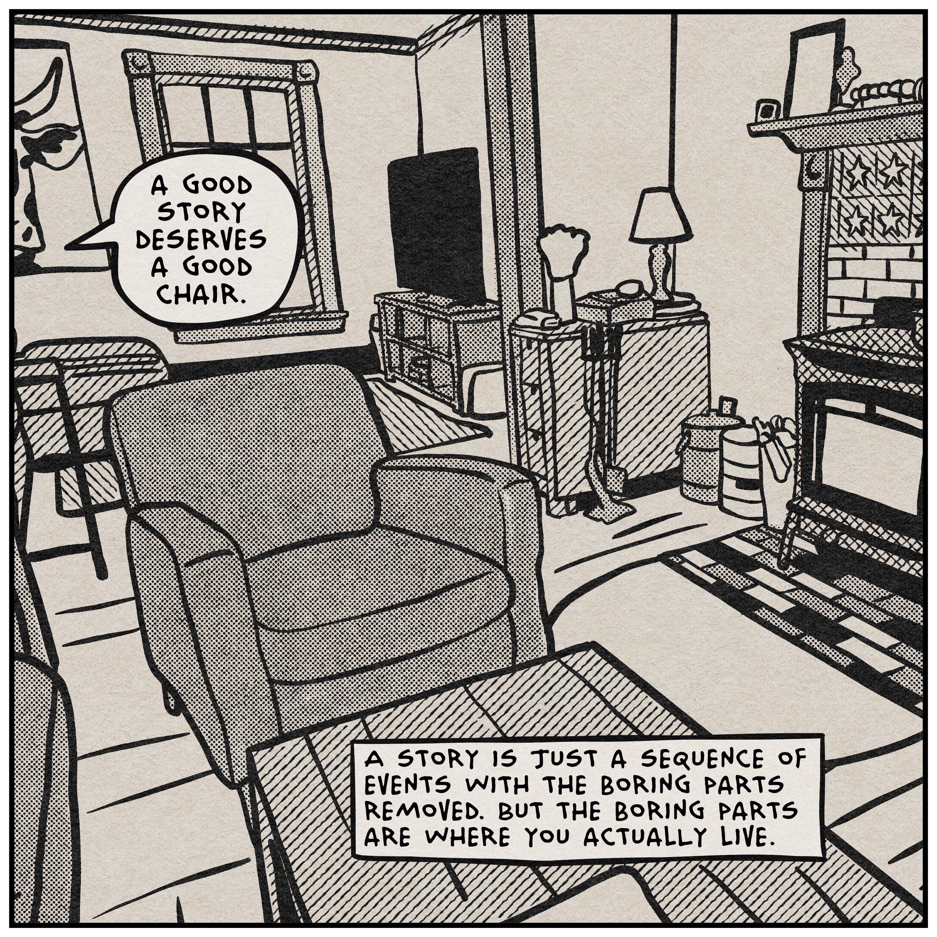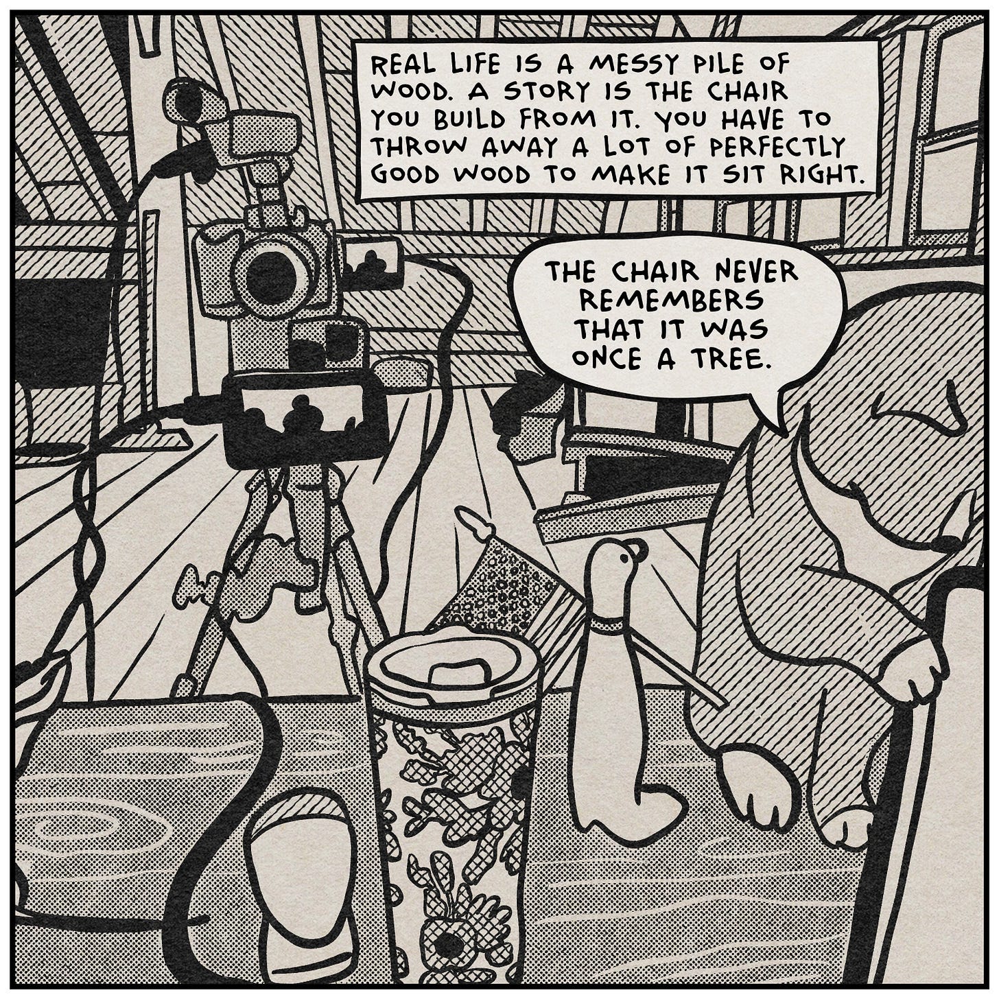Storytelling means throwing away perfectly good wood. You start by looking for the shape of a chair within the mess of a forest. And from that mess of timber, you craft a chair that can support your weight. The tragedy of the craft is that the finished piece never remembers the living thing it used to be.