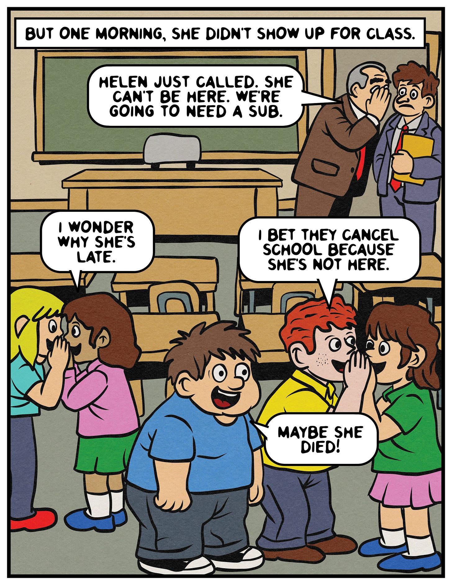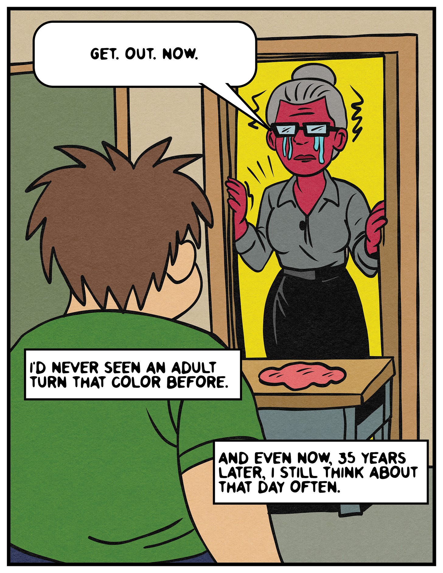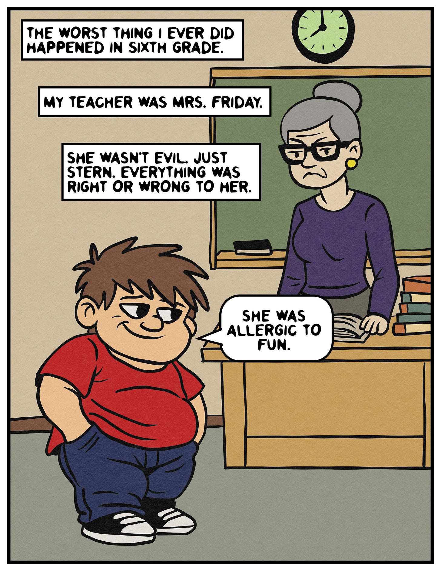 And if you are Mrs. Friday (which is not really your name), and by some stroke of cosmic force you stumbled upon this comic strip recollection from a kid who was in your 1991-1992 sixth-grade class, please know that I am truly sorry. I feel horrible for what I did to you. You were so incredibly heartbroken, and you were being honest and vulnerable by sharing what happened with the class. And it was appalling how I treated you. I still think about my actions a lot. I am filled with regret and shame when I look back on how I hurt you.